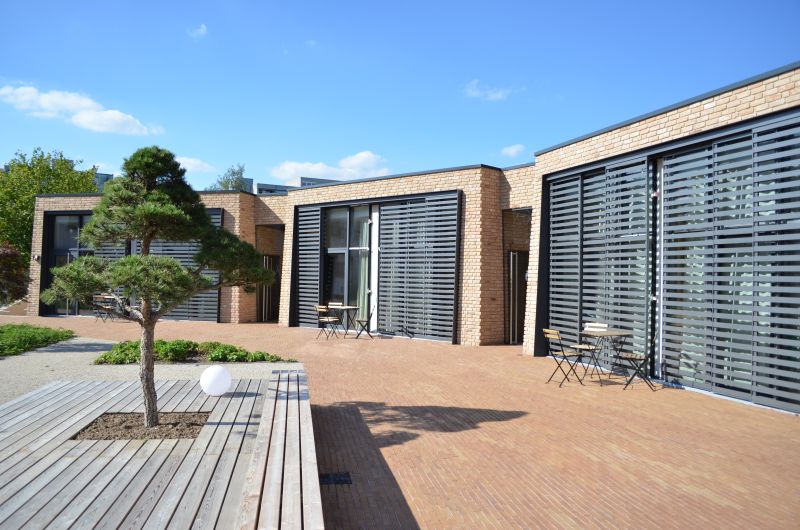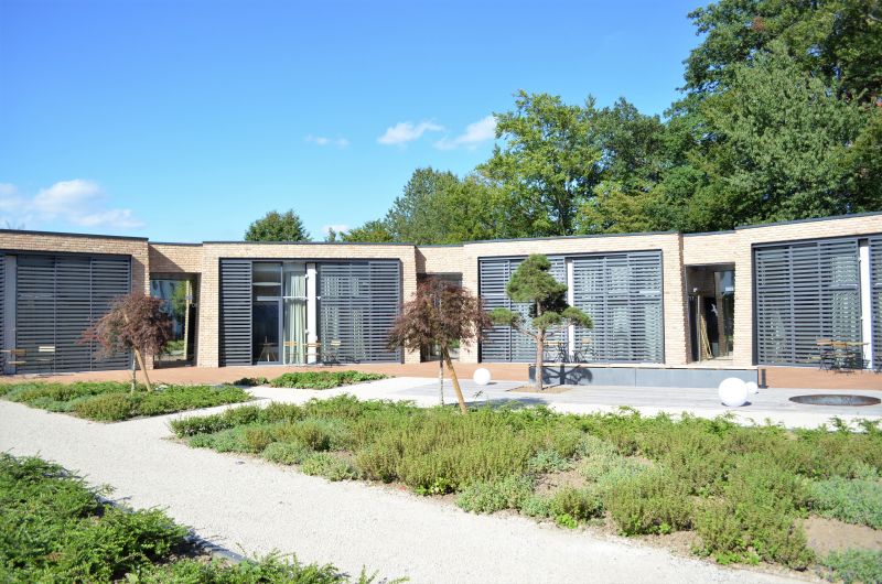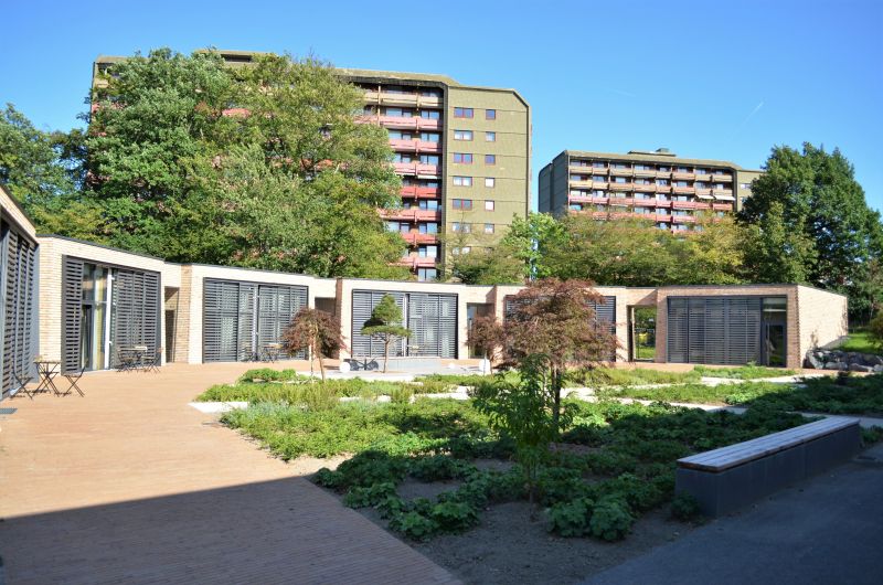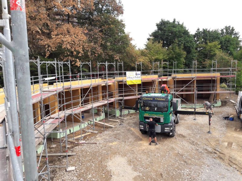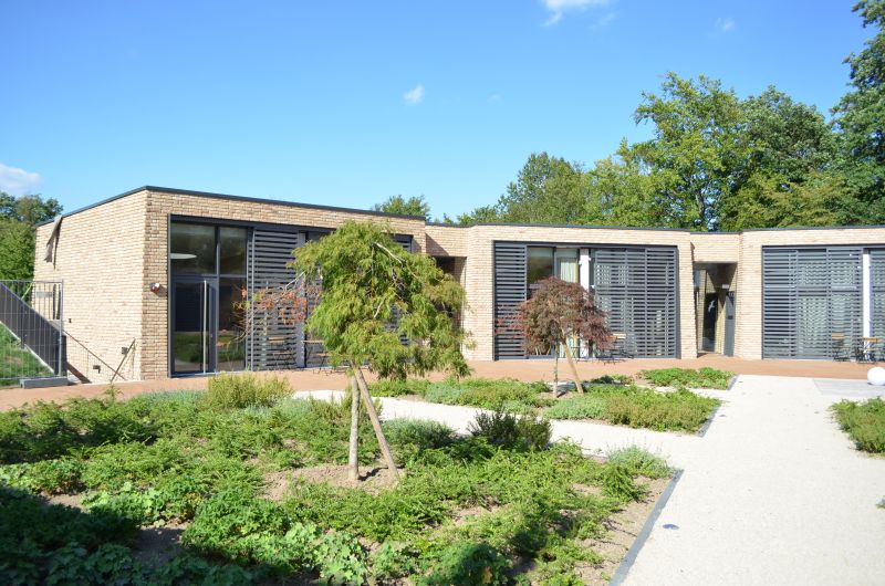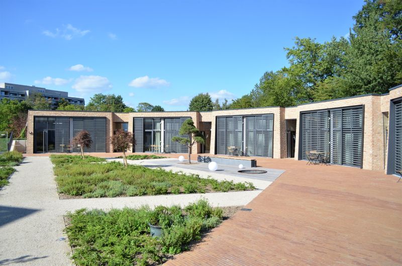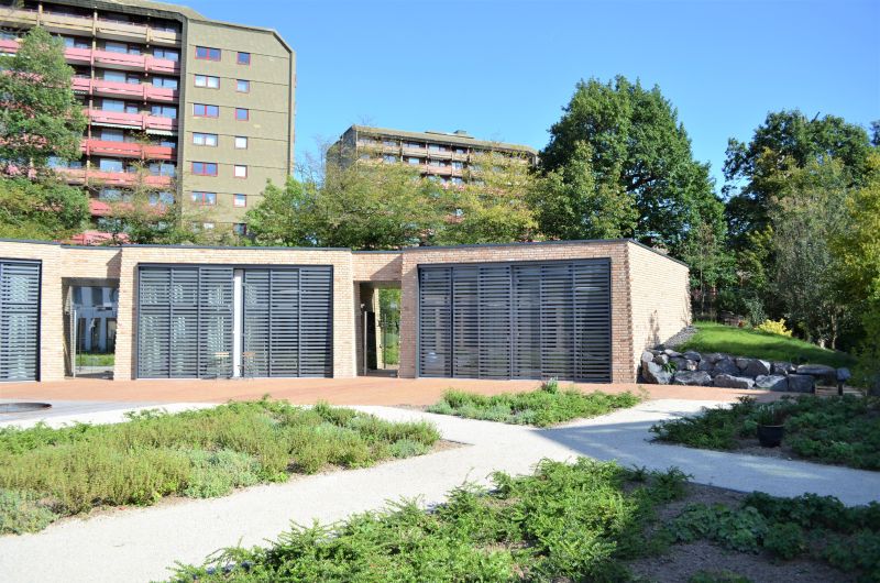 Das neue Apartmentgebäude in Holzständerbauweise fügt sich nahtlos in den Garten des Gesundheitszentrums ein. Die Konstruktion in Holzbauweise, die Fassade in Stein. Man sieht, den Gestaltungsmöglichkeiten und dem Materialmix sind keine Grenzen gesetzt.