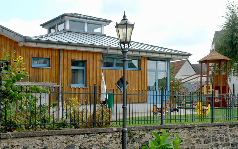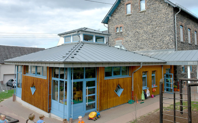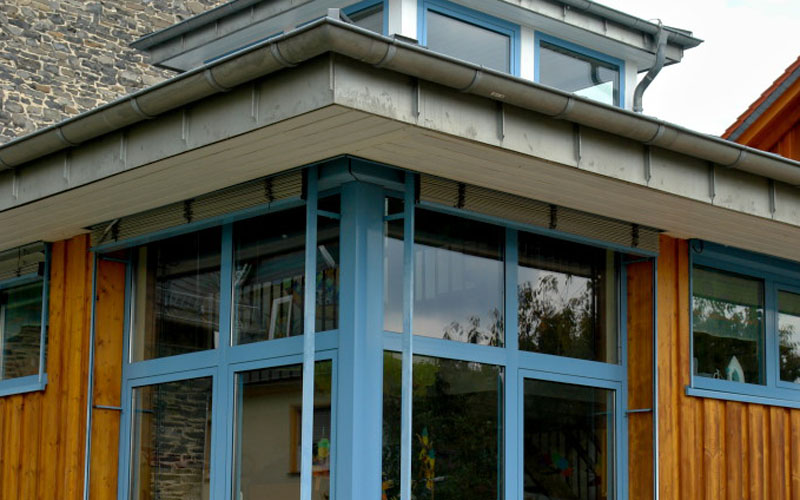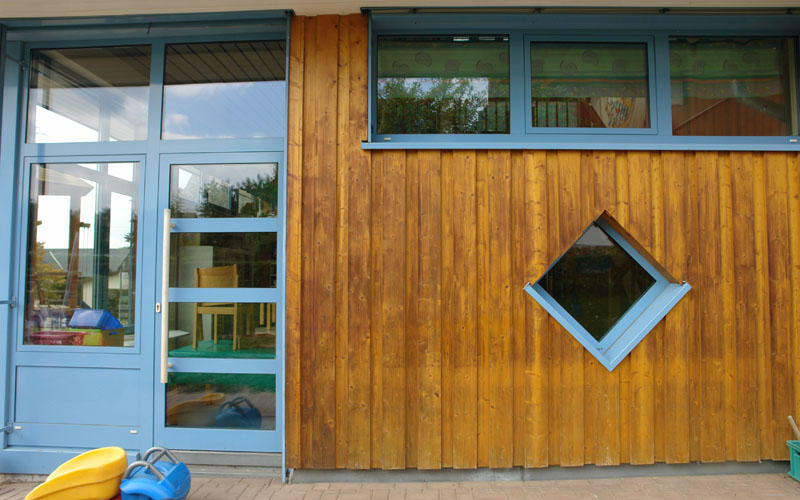 Fassadenverkleidung in Boden-Deckelschalung harmoniert mit den Metallelementen farblich abgesetzt hervorragend.