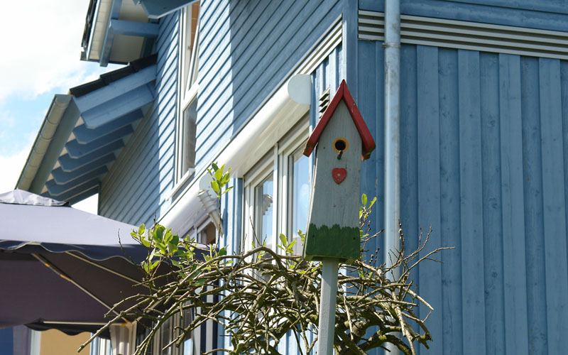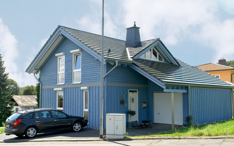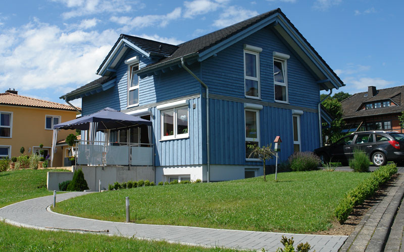 Das blaue Haus wird von einer dreiköpfigen Familie bewohnt. Offenes Wohnen, helle Räume und viel Platz. Und die Freude über die niedrige Gasrechnung.