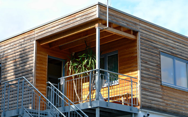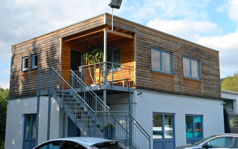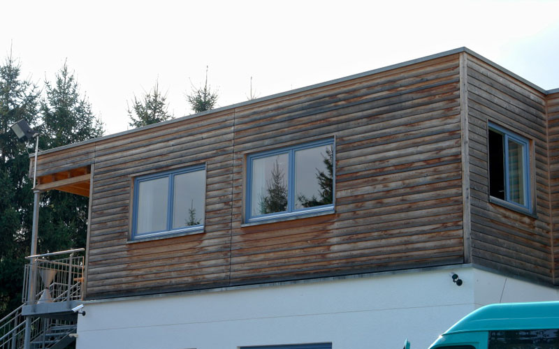 Die Aufstockung des Bürogebäudes in Holzrahmenbauweise wurde mit naturbelassener Lärche-Keilstülpschalung verkleidet. Die Vergrauung der Lärche Schalung ist ein natürlicher Vorgang, der sich über mehrere Jahre erstreckt. Es bedarf nie eines Anstriches und das Holz erhält seine attraktive Patina.