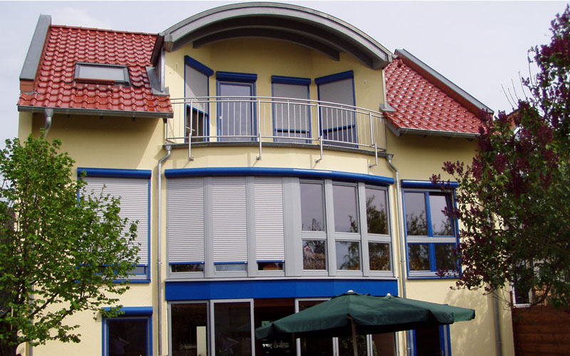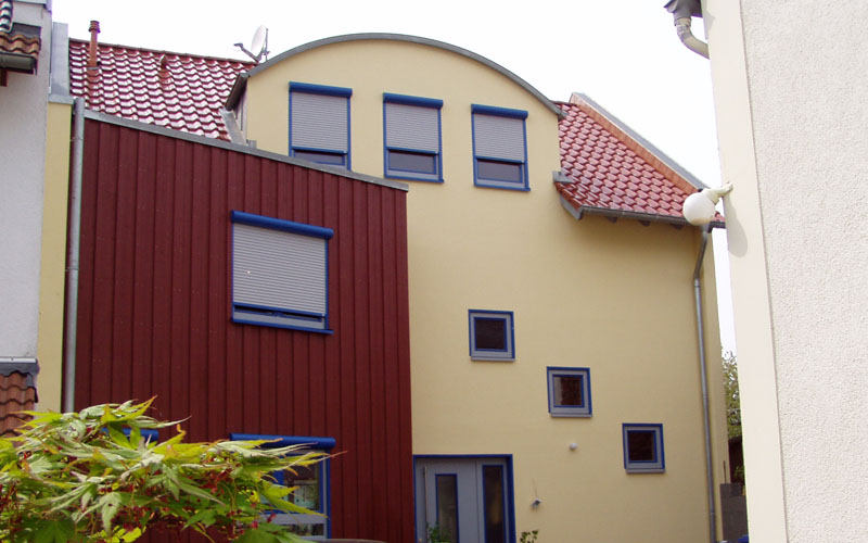 Ein Wohnhaus in Holzbauweise mit einem Fassaden-Materialmix aus Putzfassade und Boden-Deckelschalung. Die runden Gauben ermöglichen einen wunderbaren Weitblick.