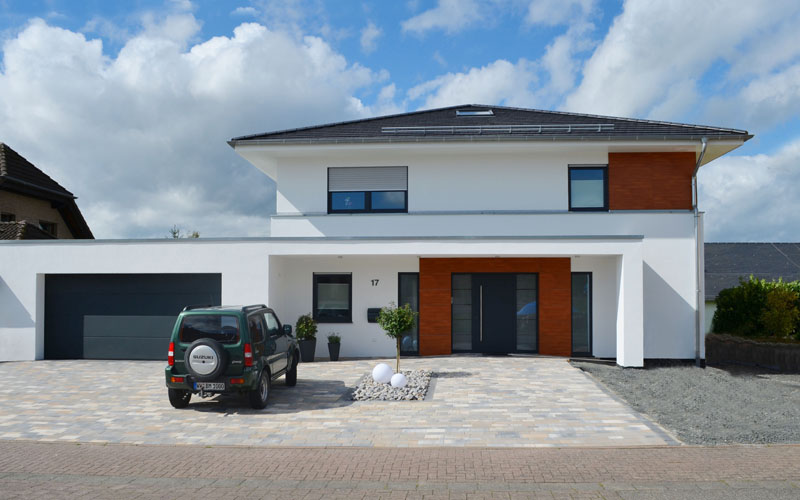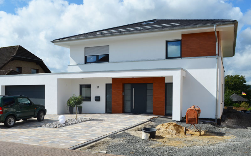 Das Erdgeschoss wurde gemauert, das Obergeschoss wurde in Holzrahmenbauweise ausgeführt. Balkenlager und Dachstuhl sind in sichtbarer Konstruktion gewählt, und strahlen eine unvergleichliche Gemütlichkeit und Natürlichkeit aus. Das Dach hat eine s.g. Aufdachdämmung. Die Holzverkleidung der Fassade und die Holz-Alu-Fenster, in grün abgesetzt harmonieren perfekt miteinander.